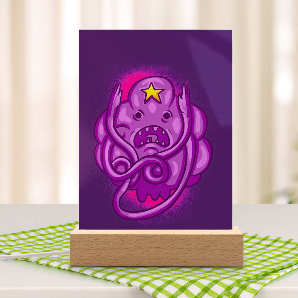 - Wood base is connected to a USB cable with button controls for adjusting the lighting.